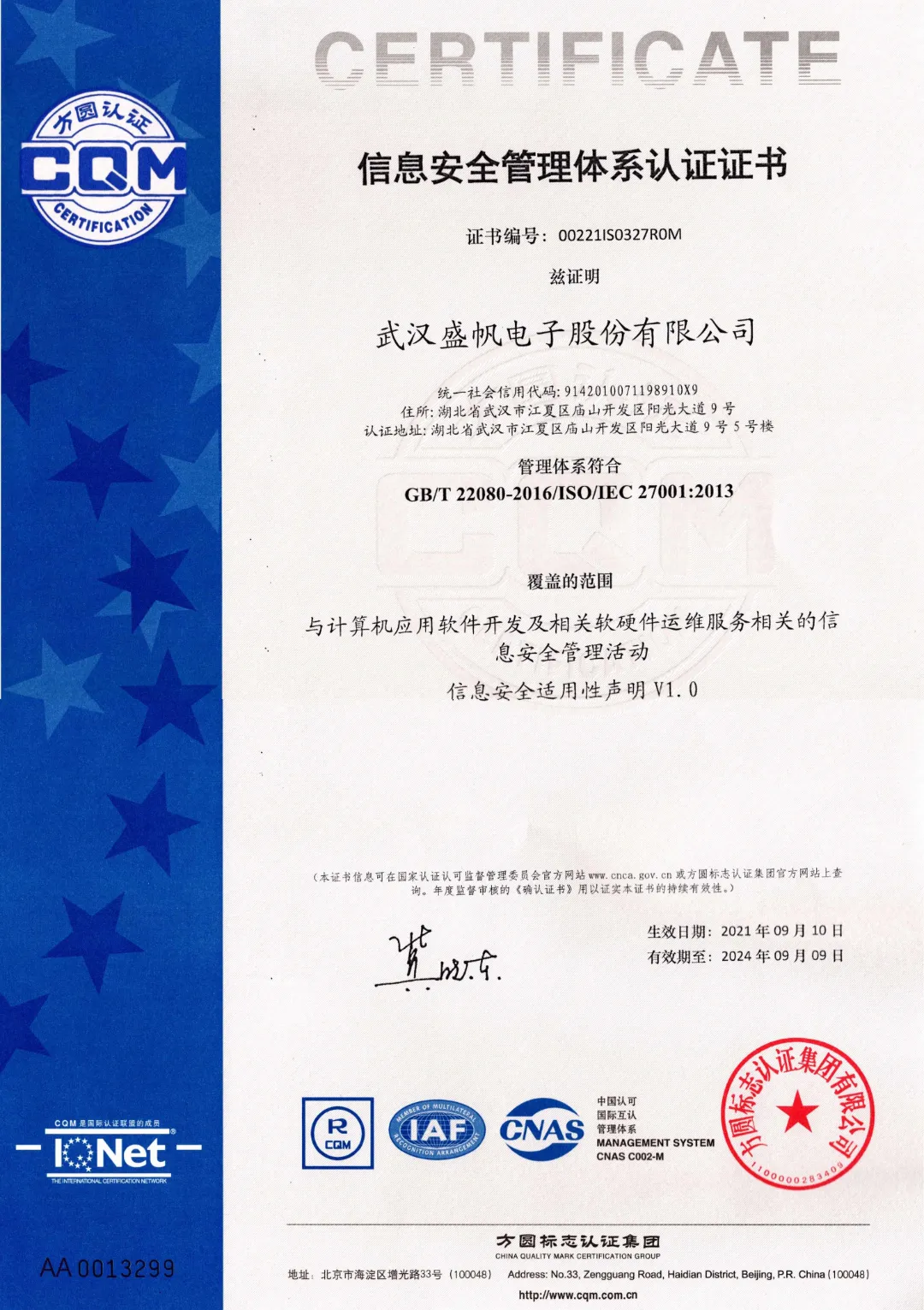 近日,武漢盛帆電子股份有限公司順利通過ISO27001測(cè)評(píng),正式獲得信息安全管理體系認(rèn)證證書。此次認(rèn)證涵蓋了與計(jì)算機(jī)應(yīng)用軟件開發(fā)及相關(guān)軟硬件運(yùn)維服務(wù)相關(guān)的信息安全管理活動(dòng)等業(yè)務(wù)板塊。