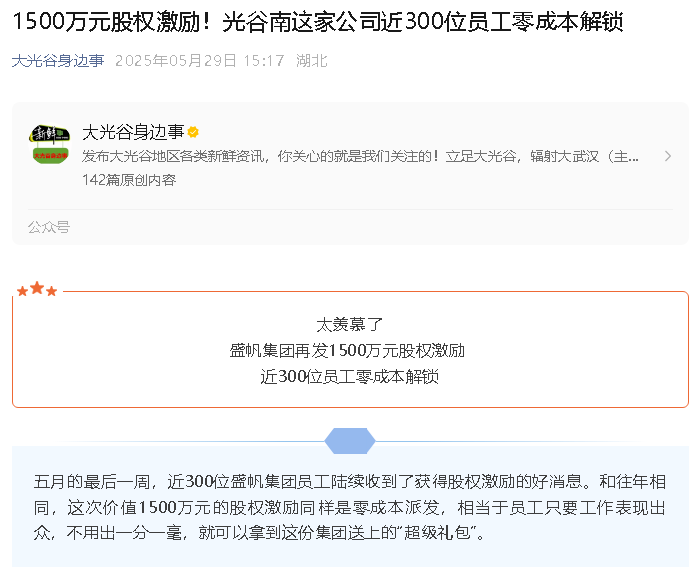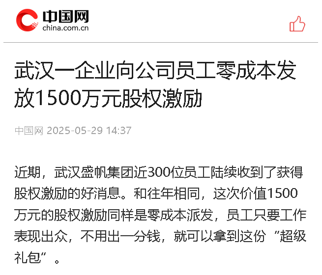 近期,武漢盛帆集團(tuán)近300位員工陸續(xù)收到了獲得股權(quán)激勵(lì)的好消息。和往年相同,這次價(jià)值1500萬(wàn)元的股權(quán)激勵(lì)同樣是零成本派···